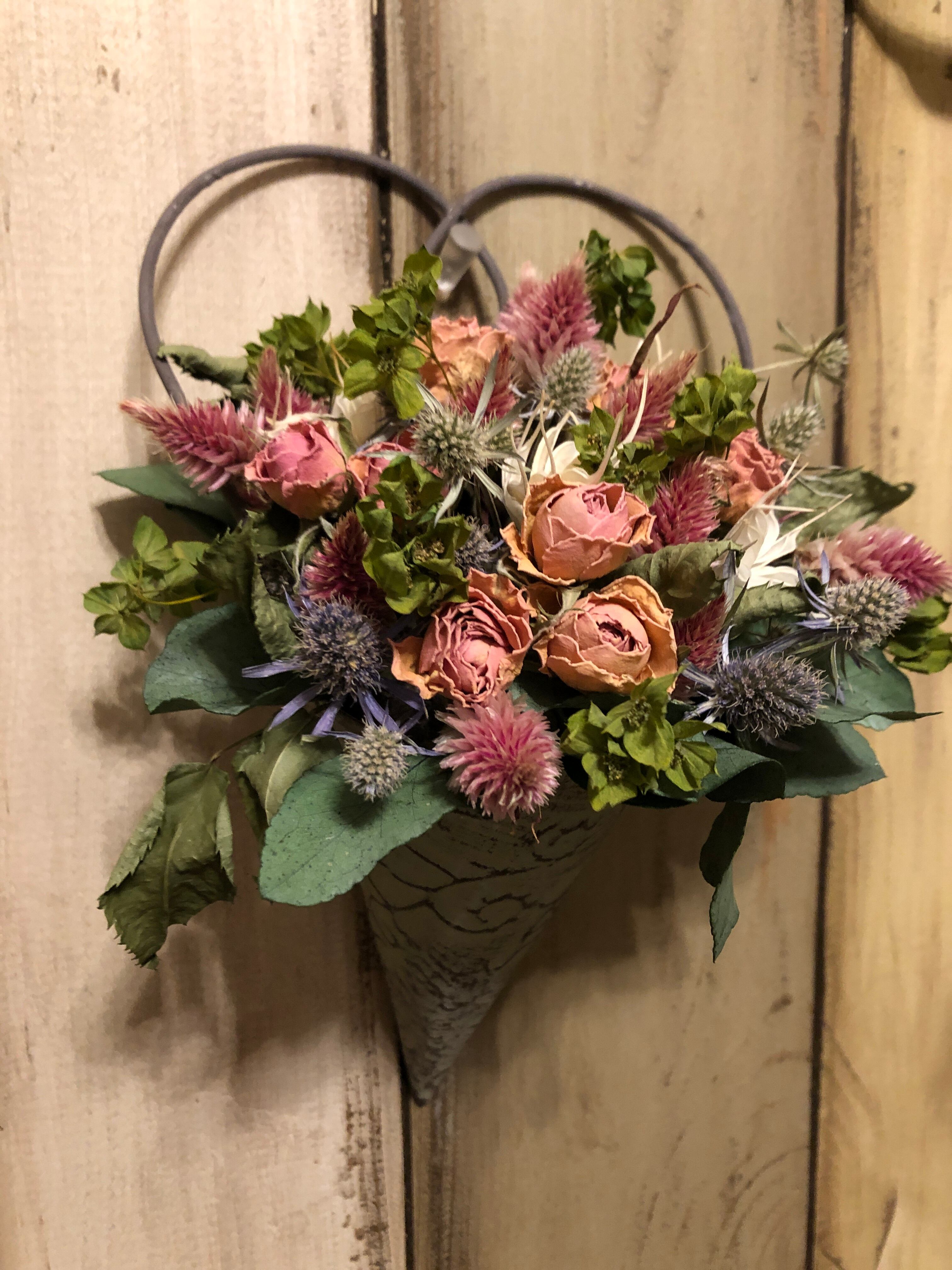 可愛く壁掛けで掛けていただいても、ハートのアイアンをスタンドにして置いていただいてもインテリアにもいかがでしょう。