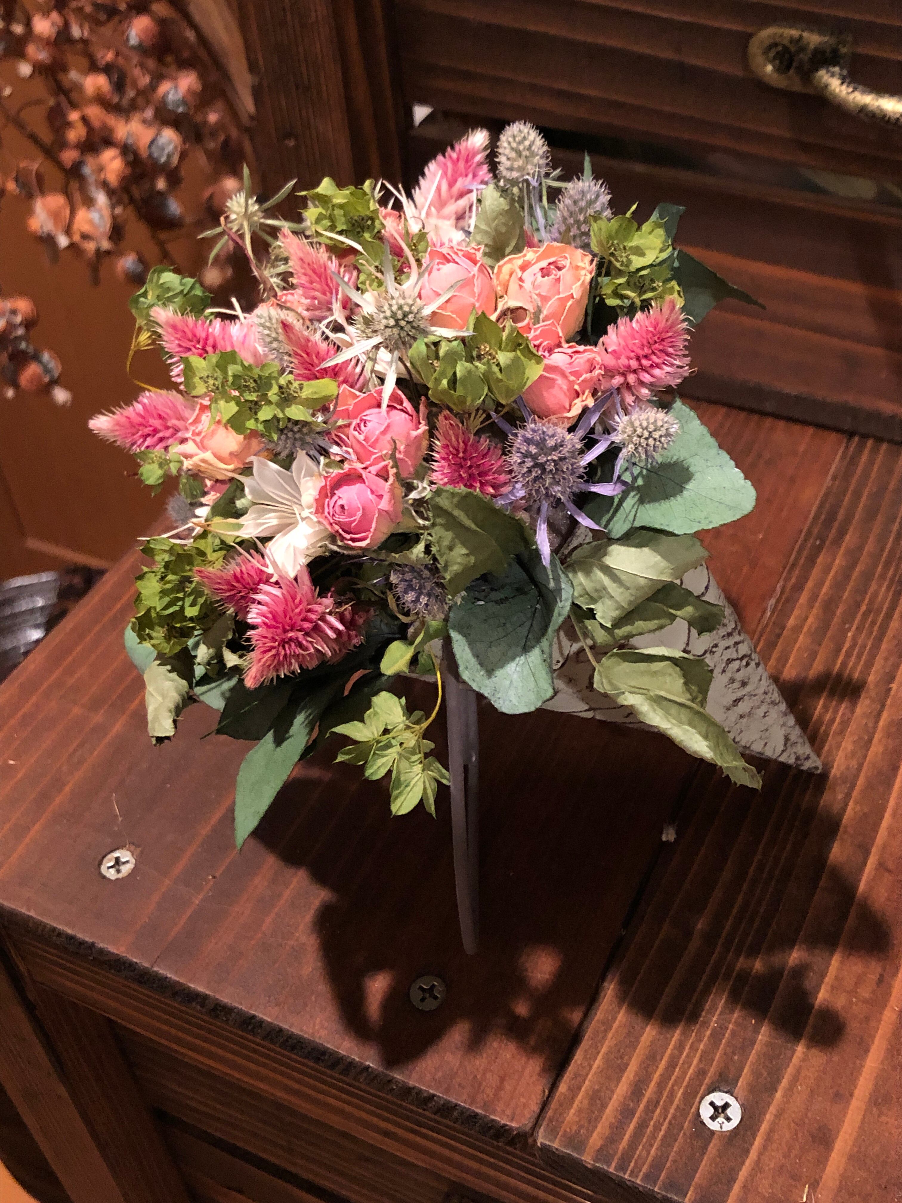 グリーンのユーカリやバラの葉、ミニのエンジリウムの優しいブルーも入れて可愛い花束のようにアレンジしました。