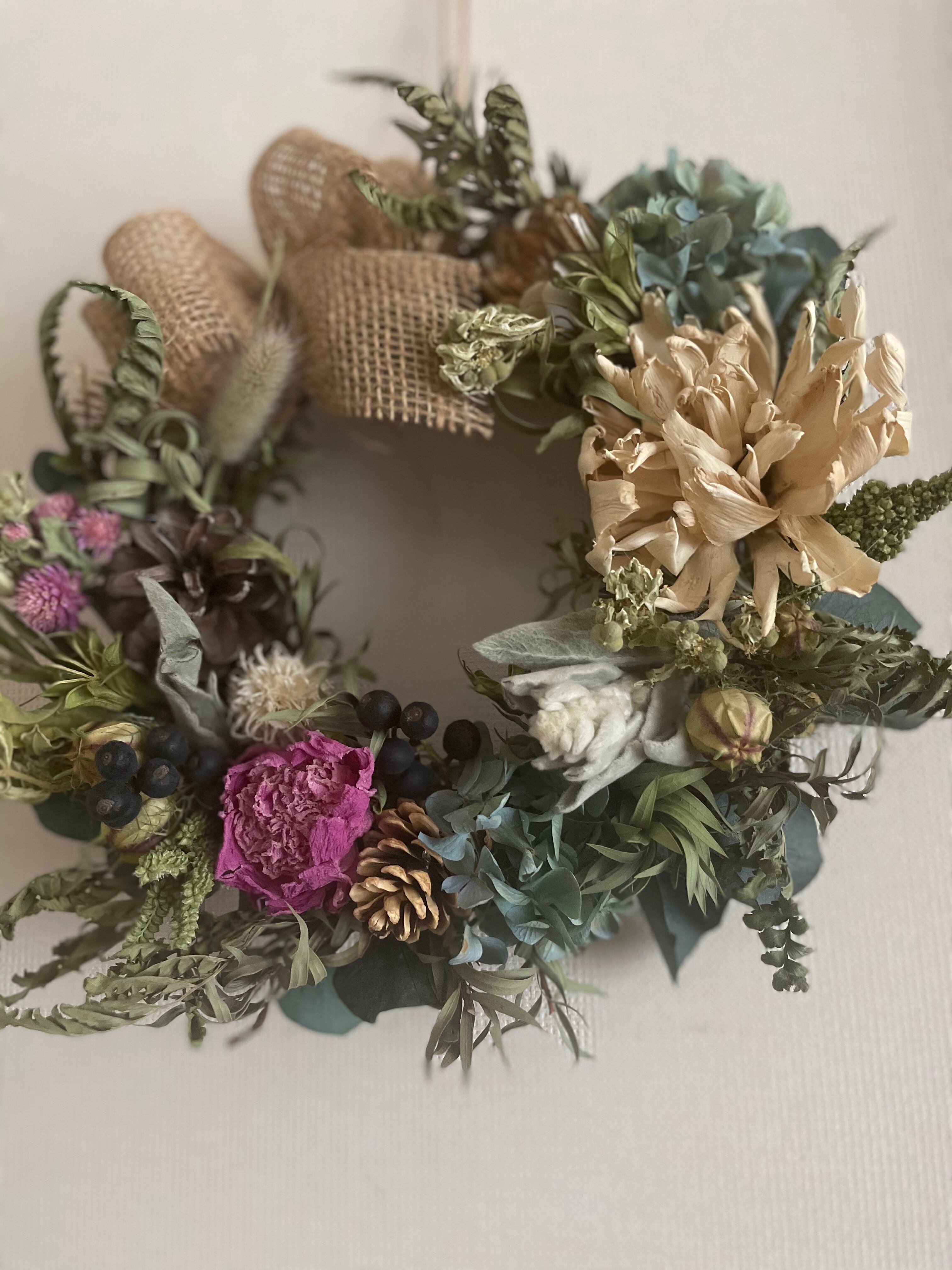 シャクヤクのドライフラワーとシャクヤクの木の皮でできているお花でグリーンの中に優しい色でリースを作りました。