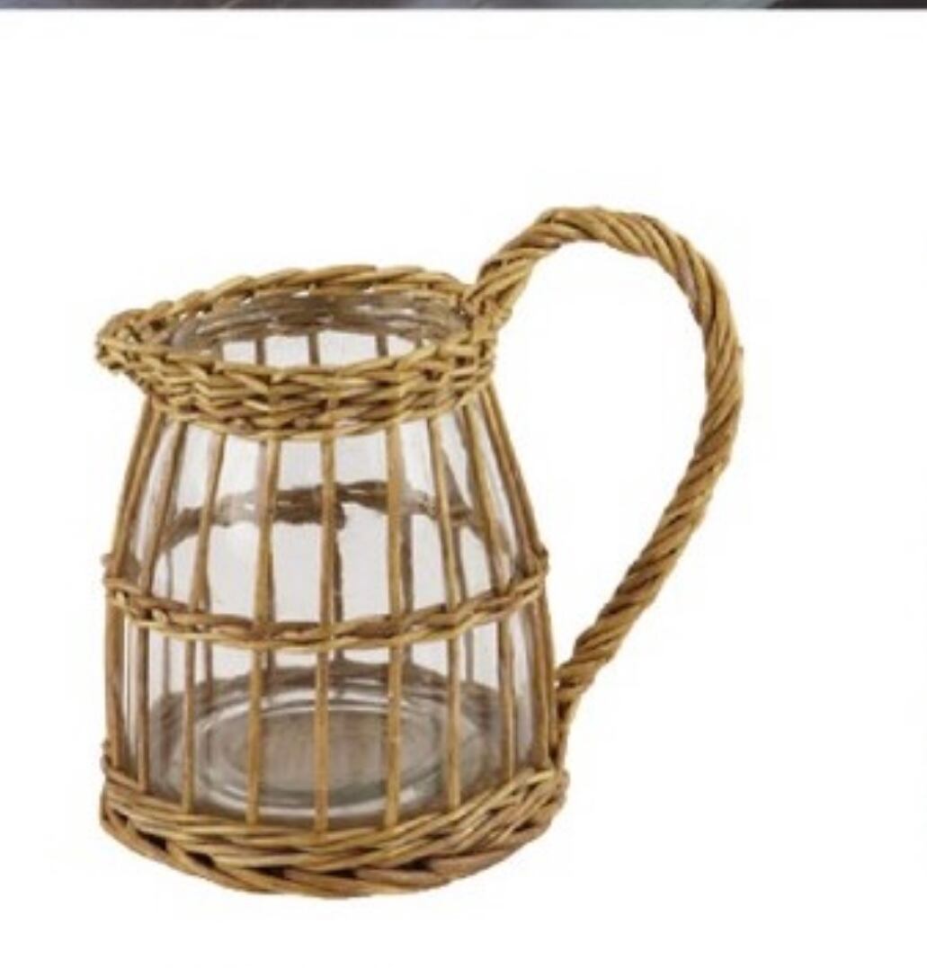 ナチュラルに編んであるカゴにしっかりしたガラスの花瓶が入っています。