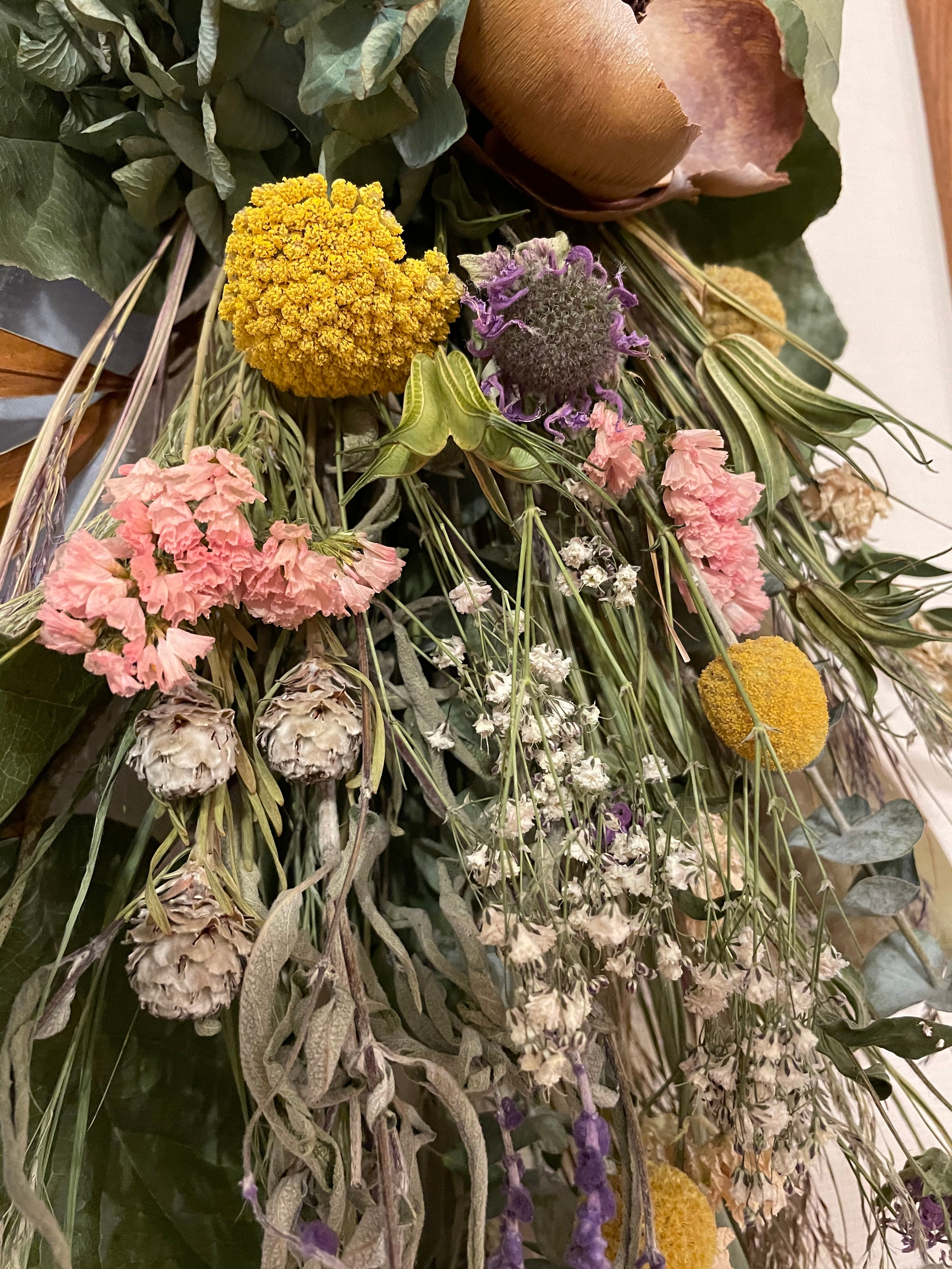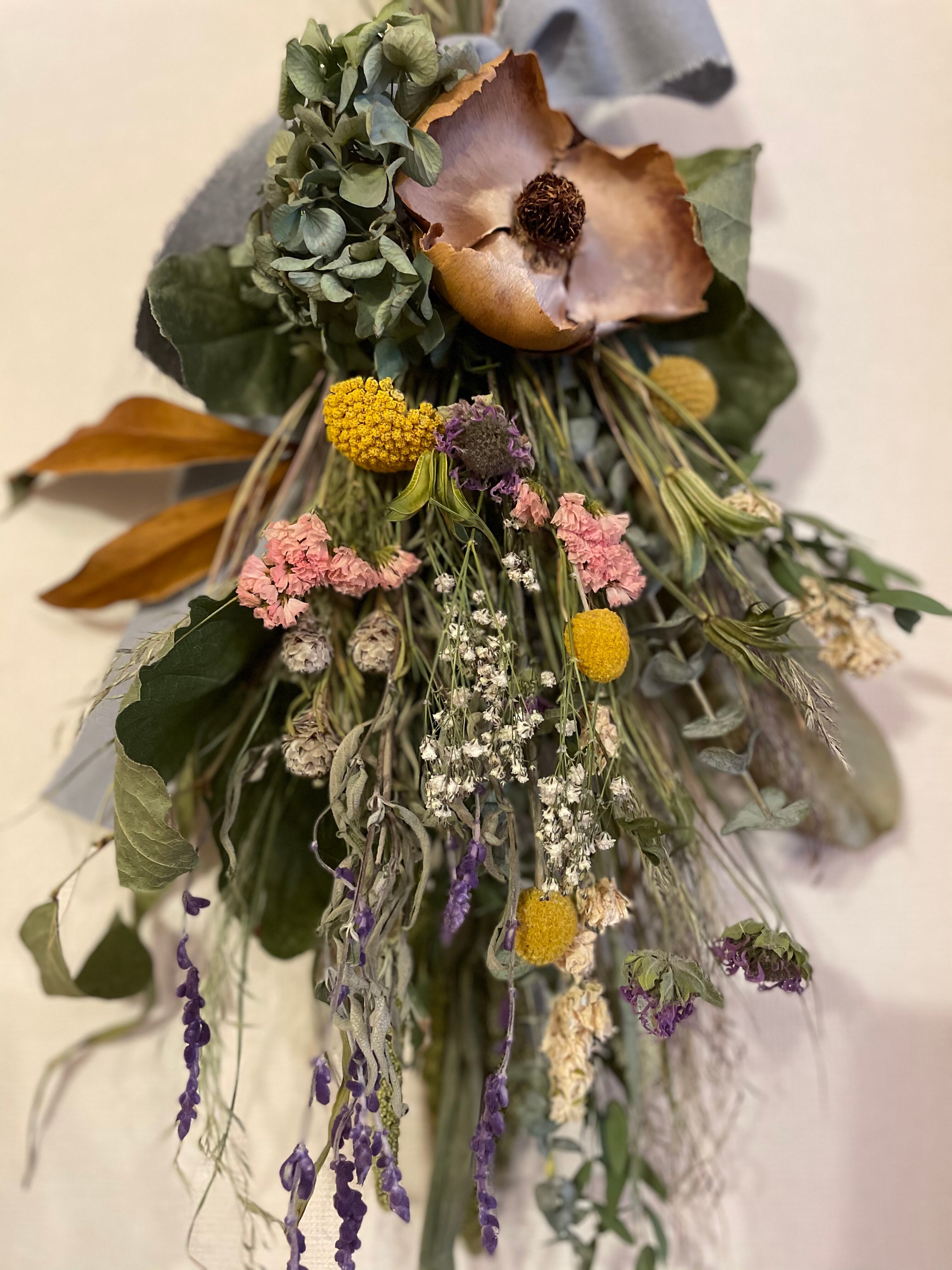 ユーカリやレモンリーフ、アワをベースにアメジストセージやラクスパー、グレビレアゴールド、かすみ草、アキレアやグラスペディアの黄色が春をつげるようです。