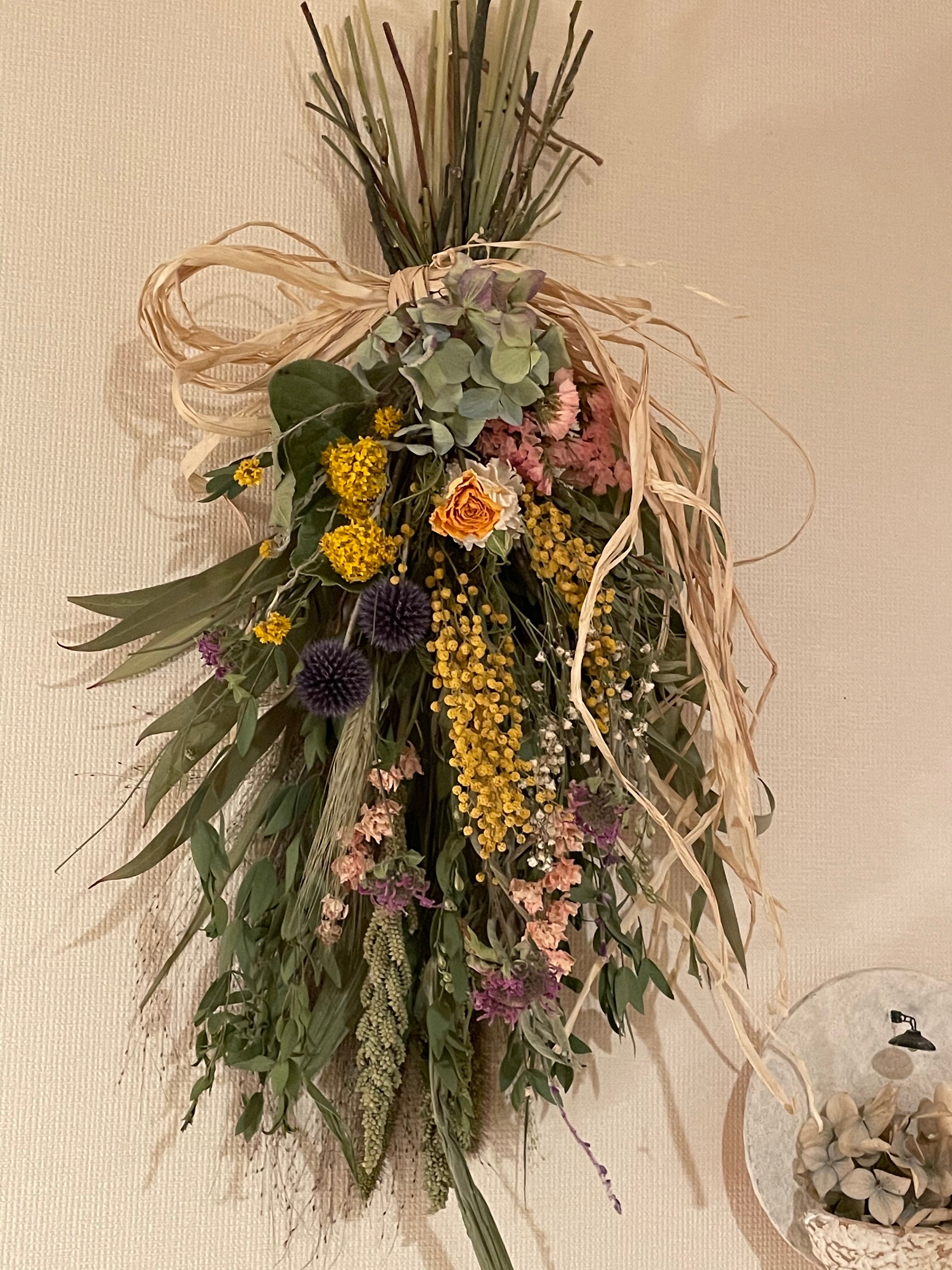 ユーカリと雑穀のグリーンいっぱいの中にミモザとバラ、紫陽花、小花を入れたボリュームのあるスワッグです。