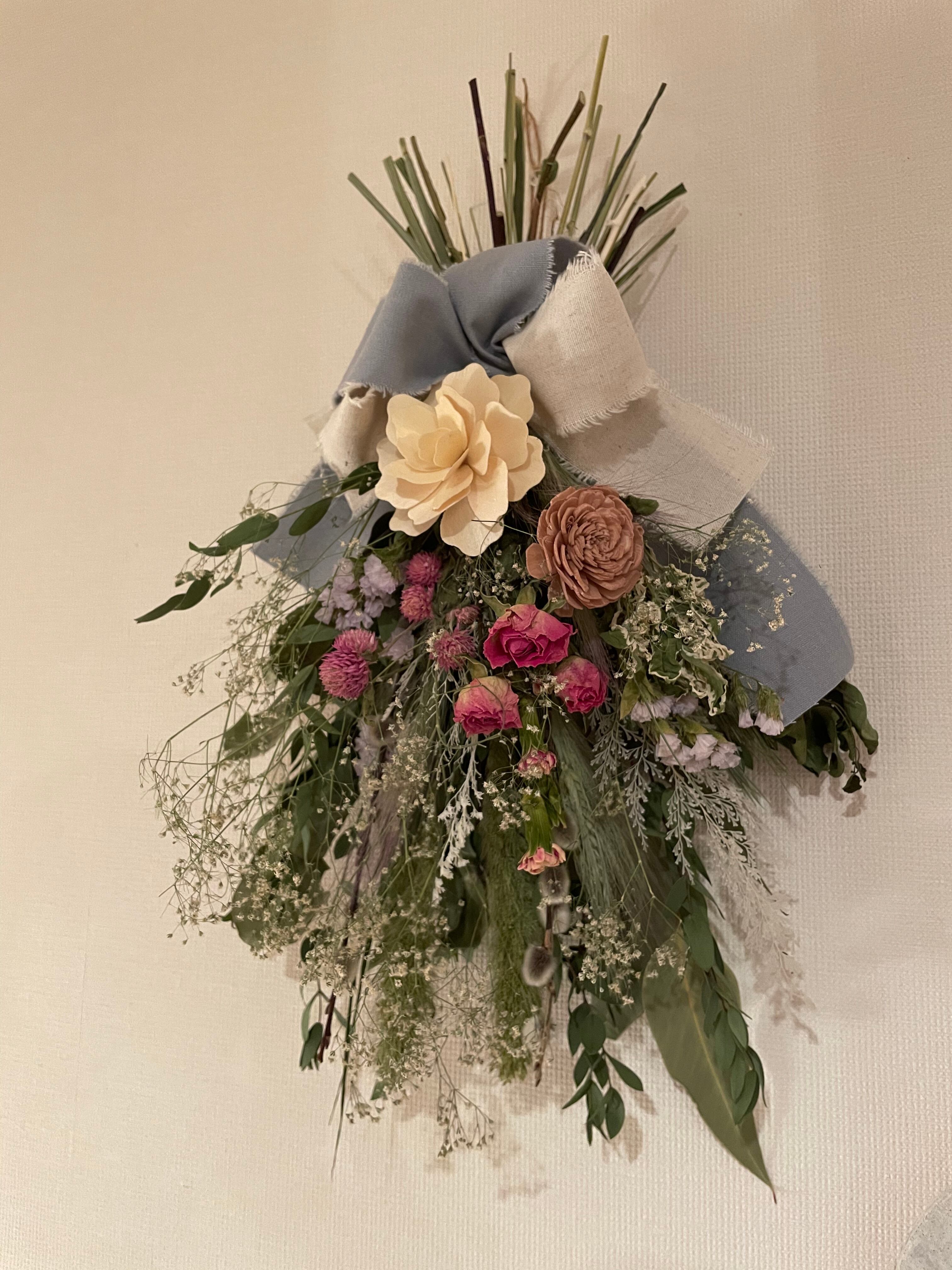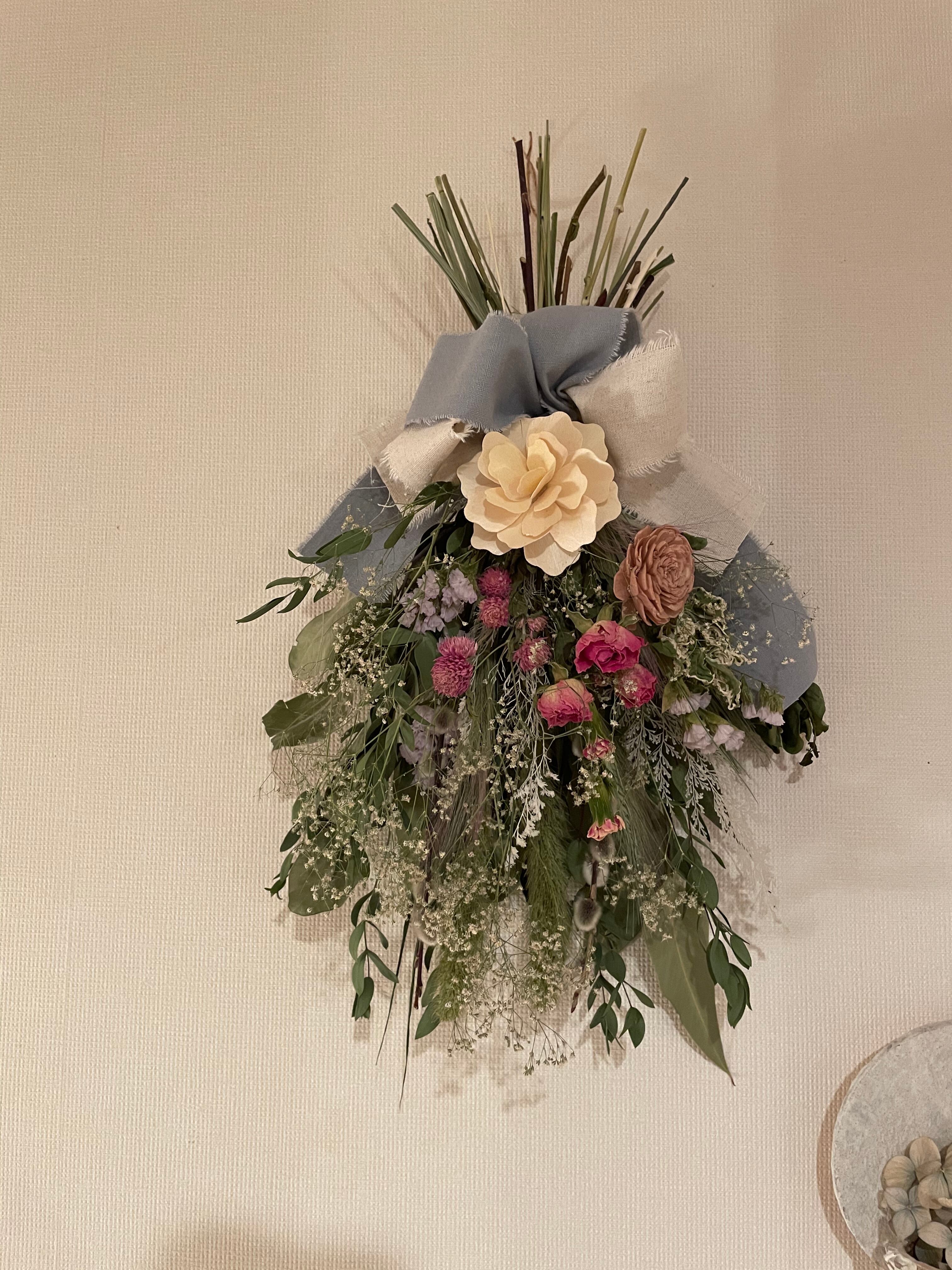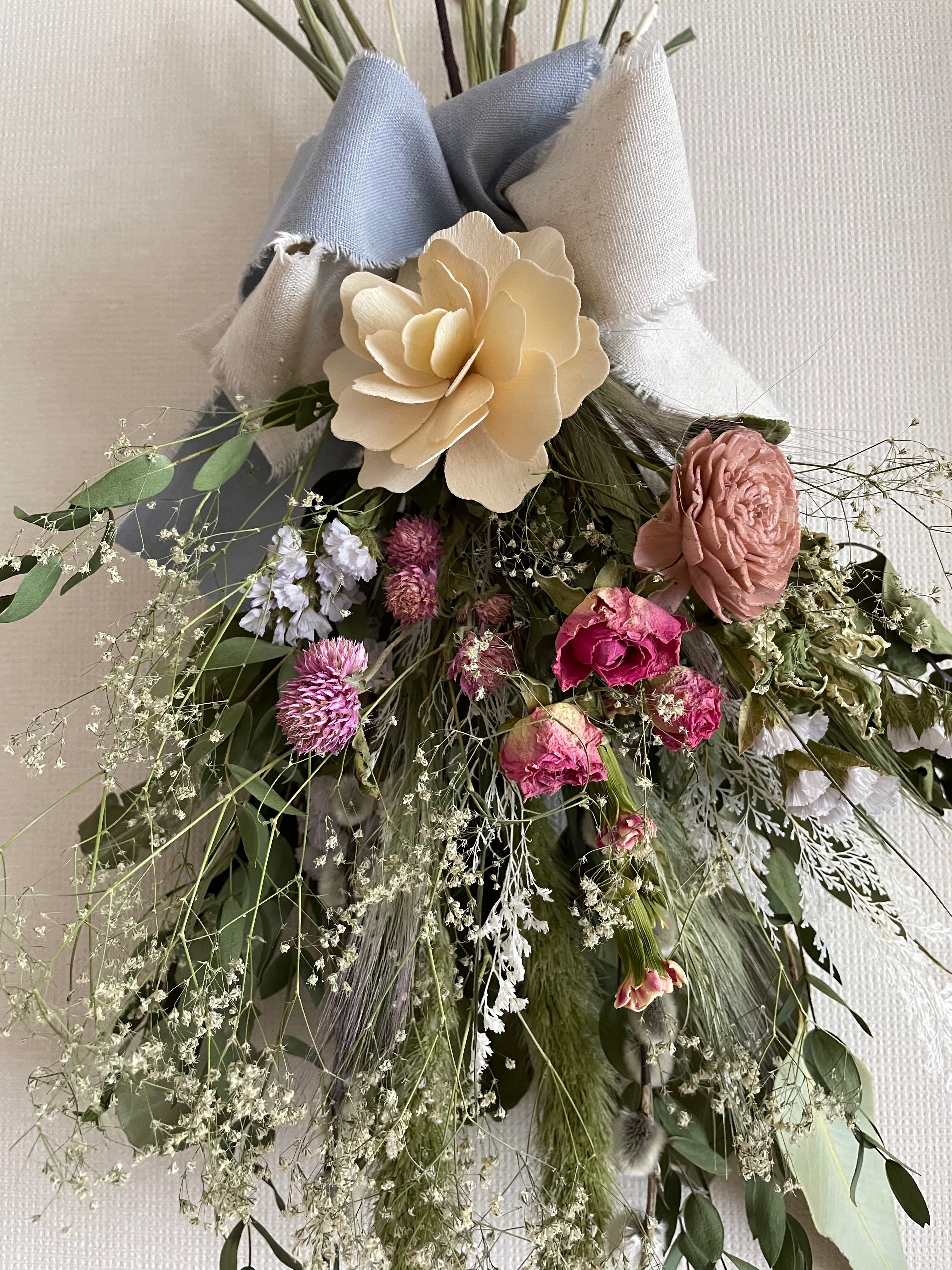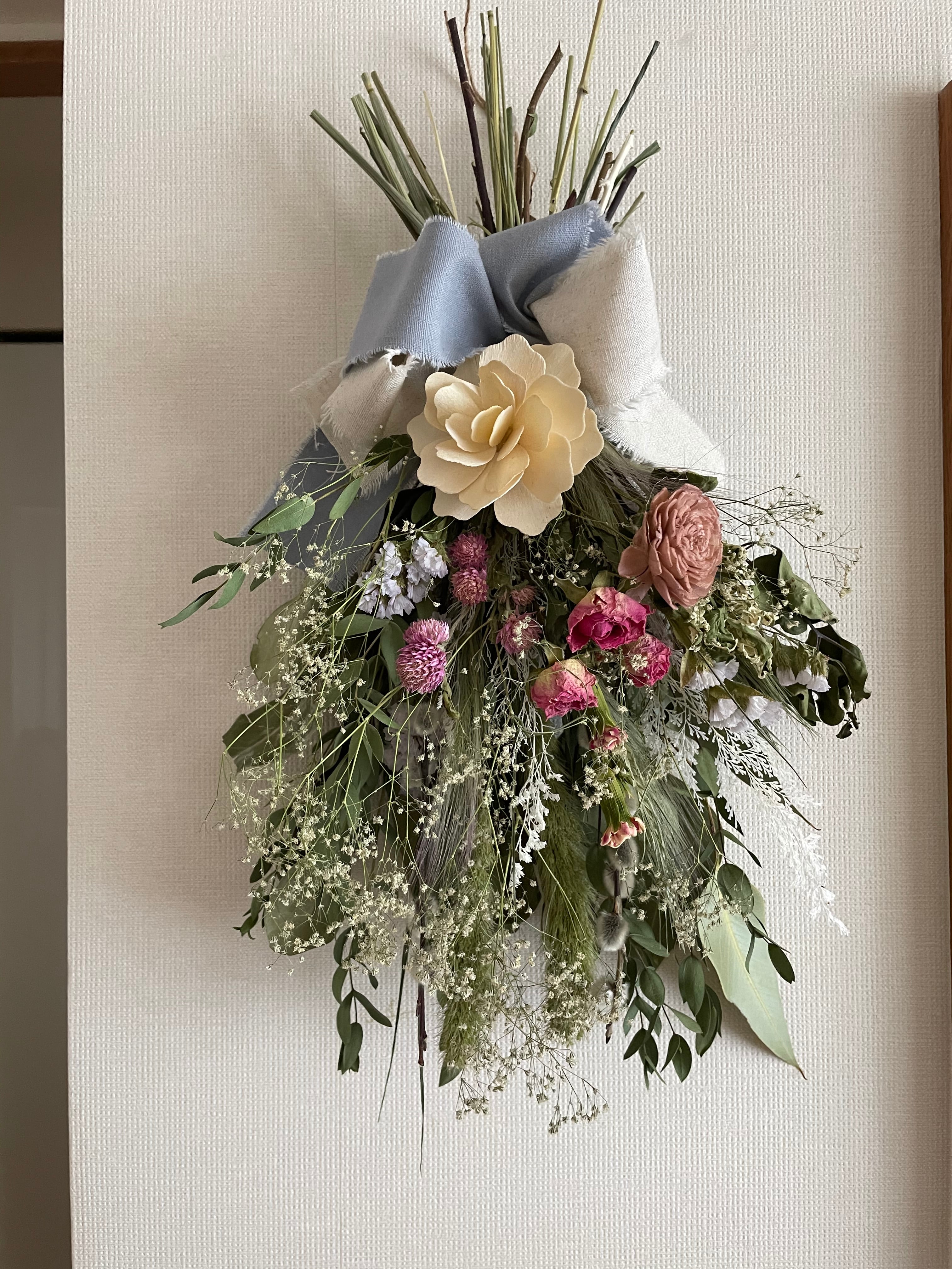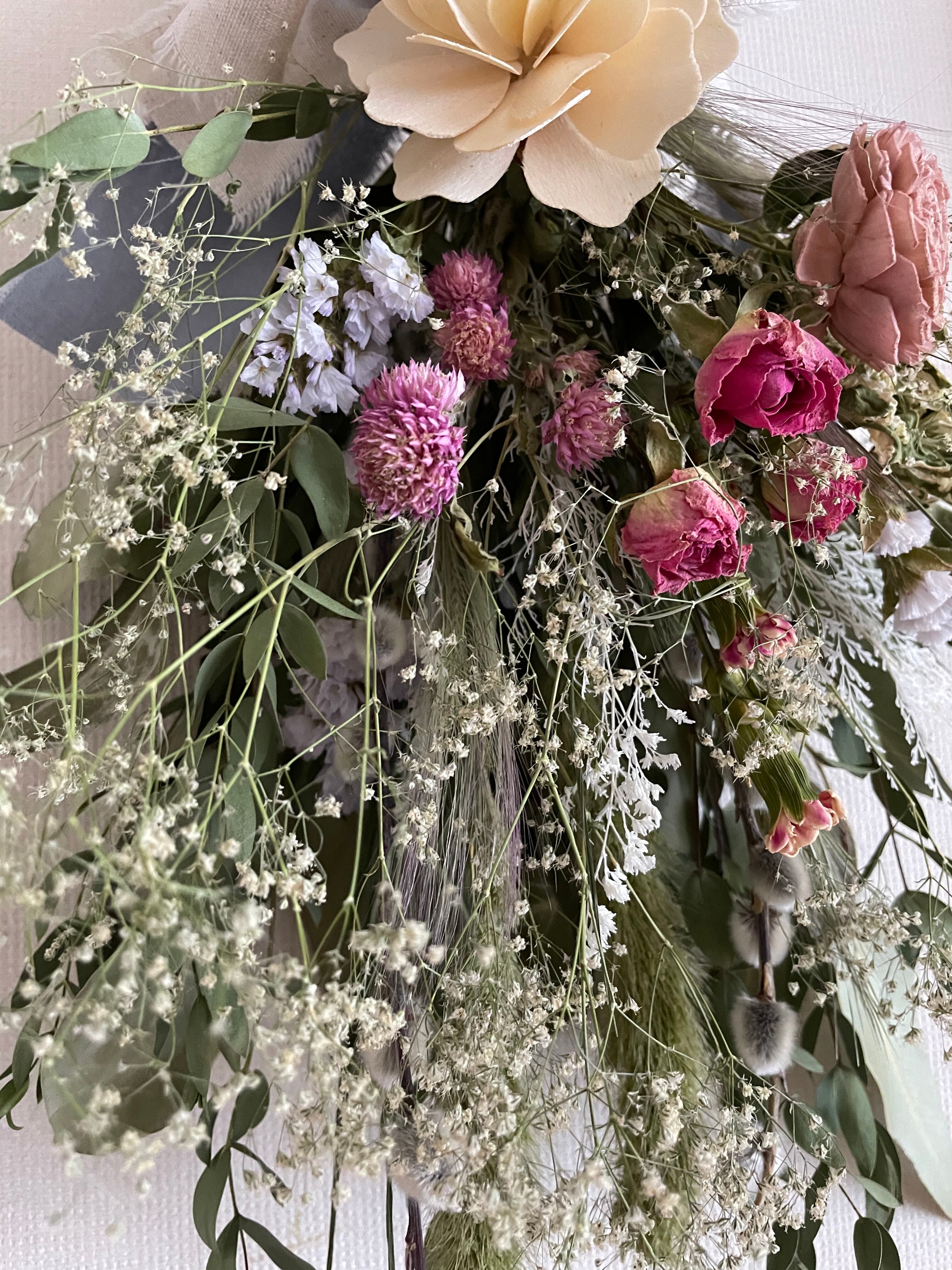ユーカリ3種類と雑穀の上にかすみ草やレースフラワーカーネーション、バラ、千日紅、ソーラーローズや白いデコローズの木のお花を載せました。可愛らしい優しいスワッグです。
