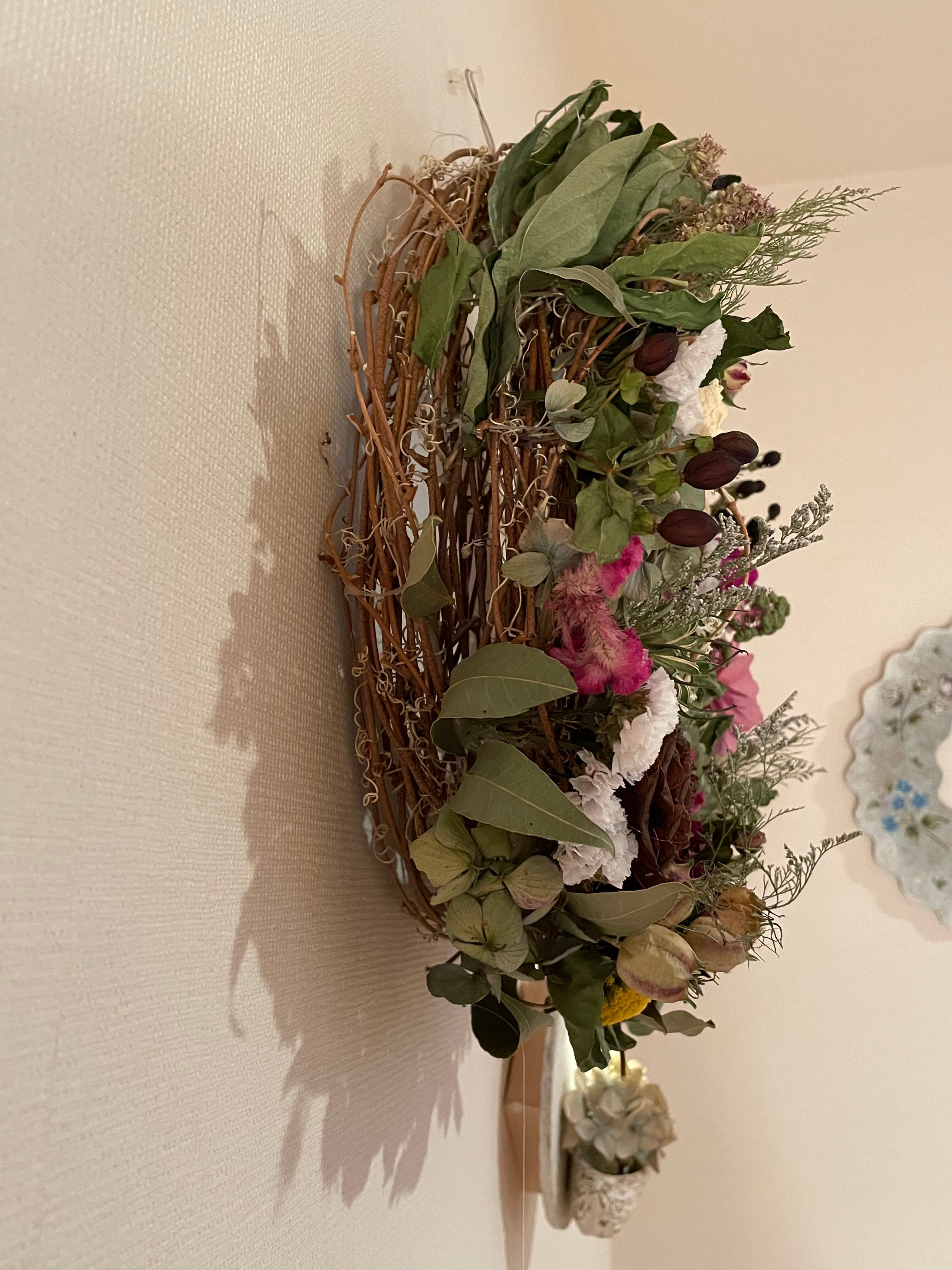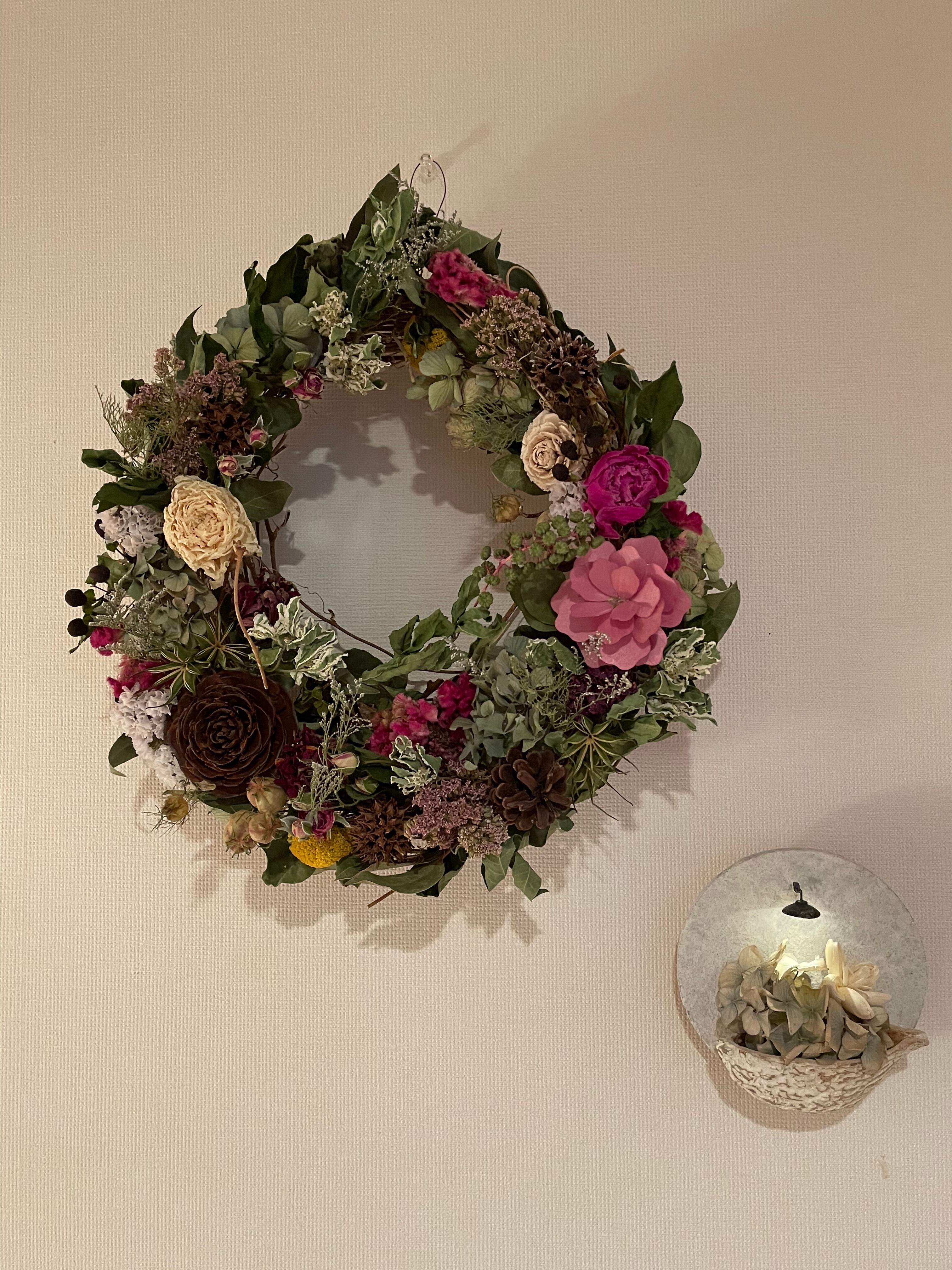 シャクヤクやケイトウ、百日草、シダローズやユーカリ、初雪草や木の実等を載せてボリュームのあるリース、お部屋や玄関に華やかな彩を添えてくれそうです。