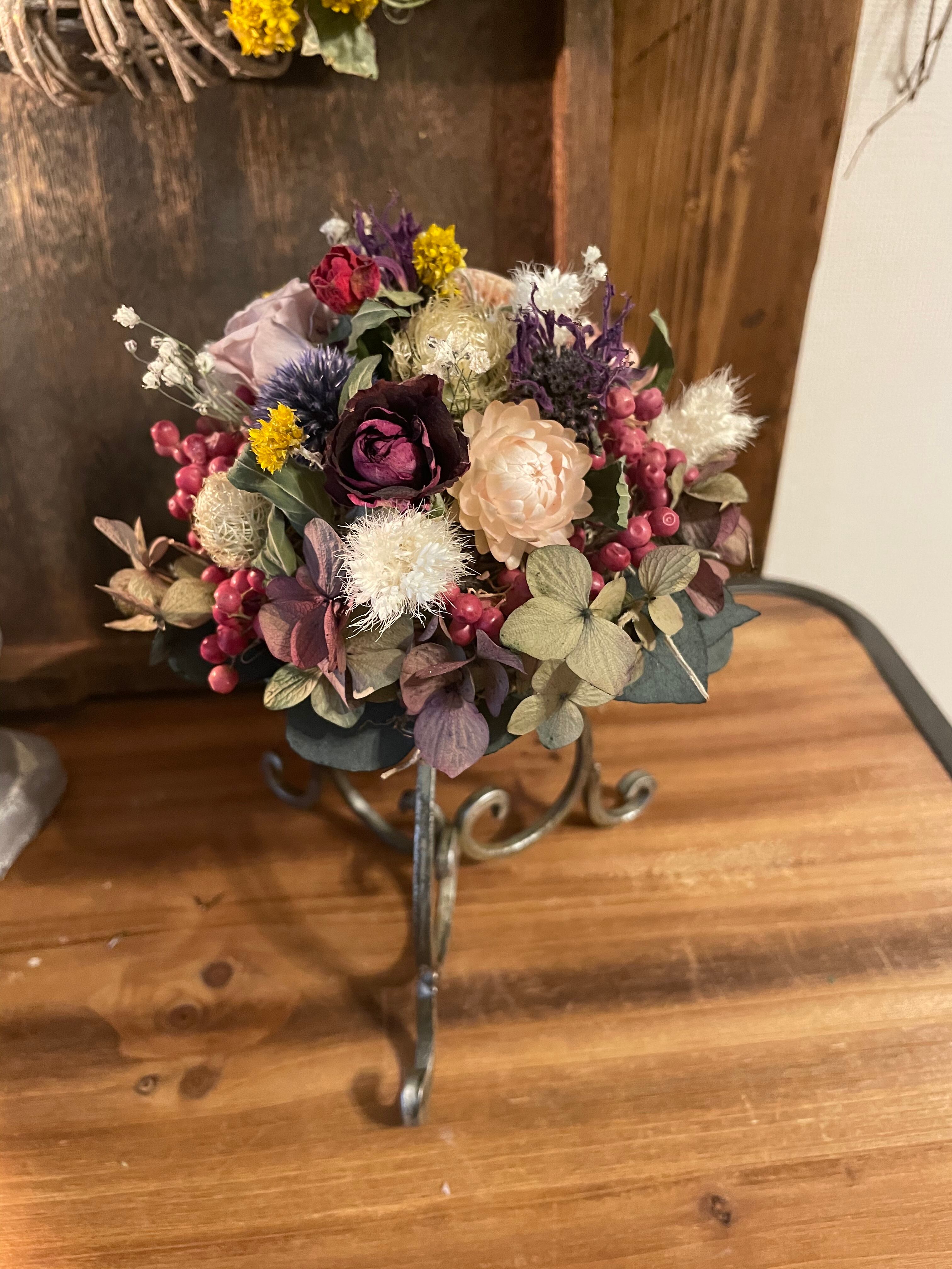 ペッパーベリーとプリザーブドのバラ、貝細工、他お花と紫陽花などをふんわりとアレンジしました。