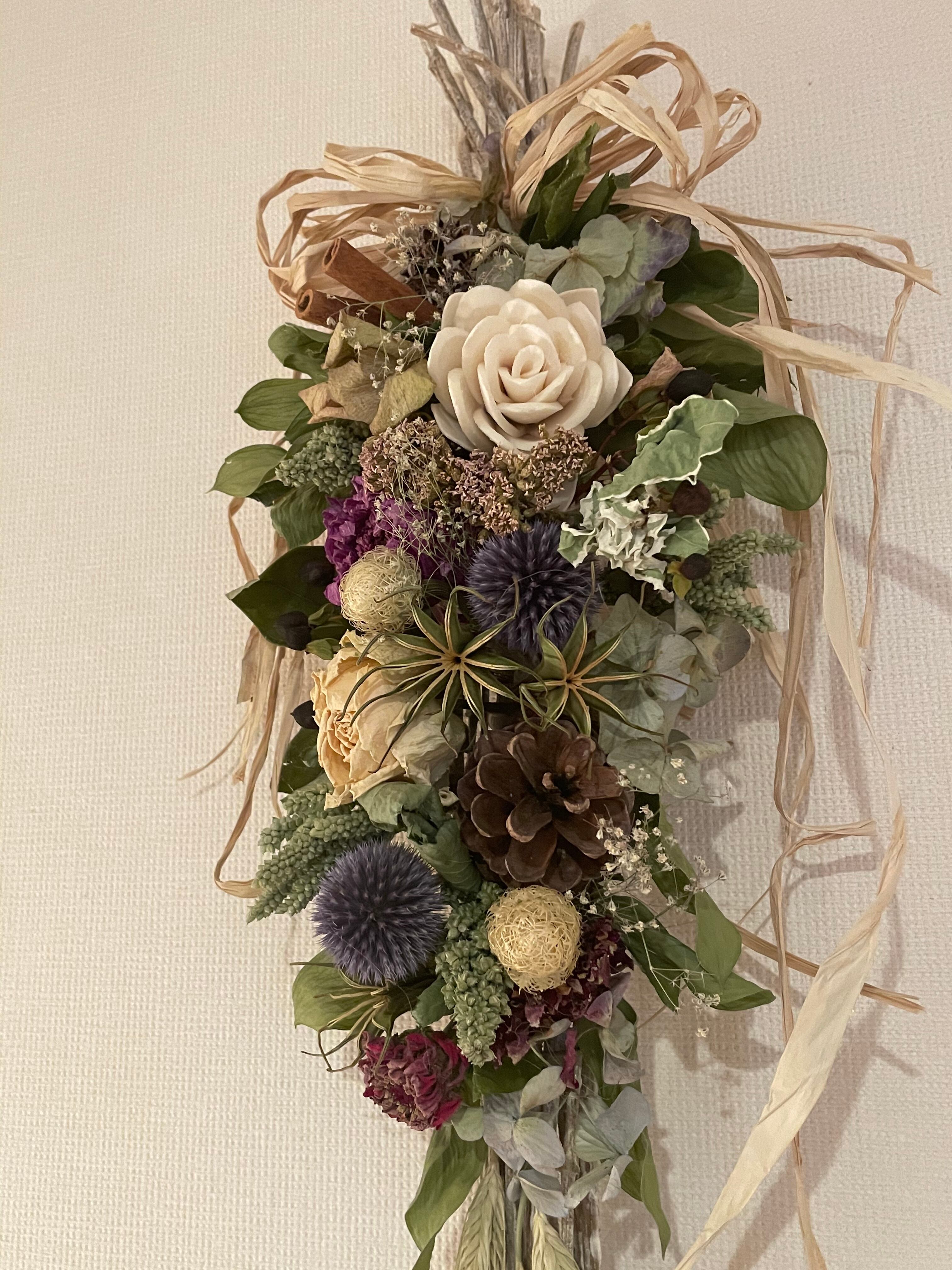 ナチュラルでインテリアにピッタリなドライフラワーの壁飾りです。