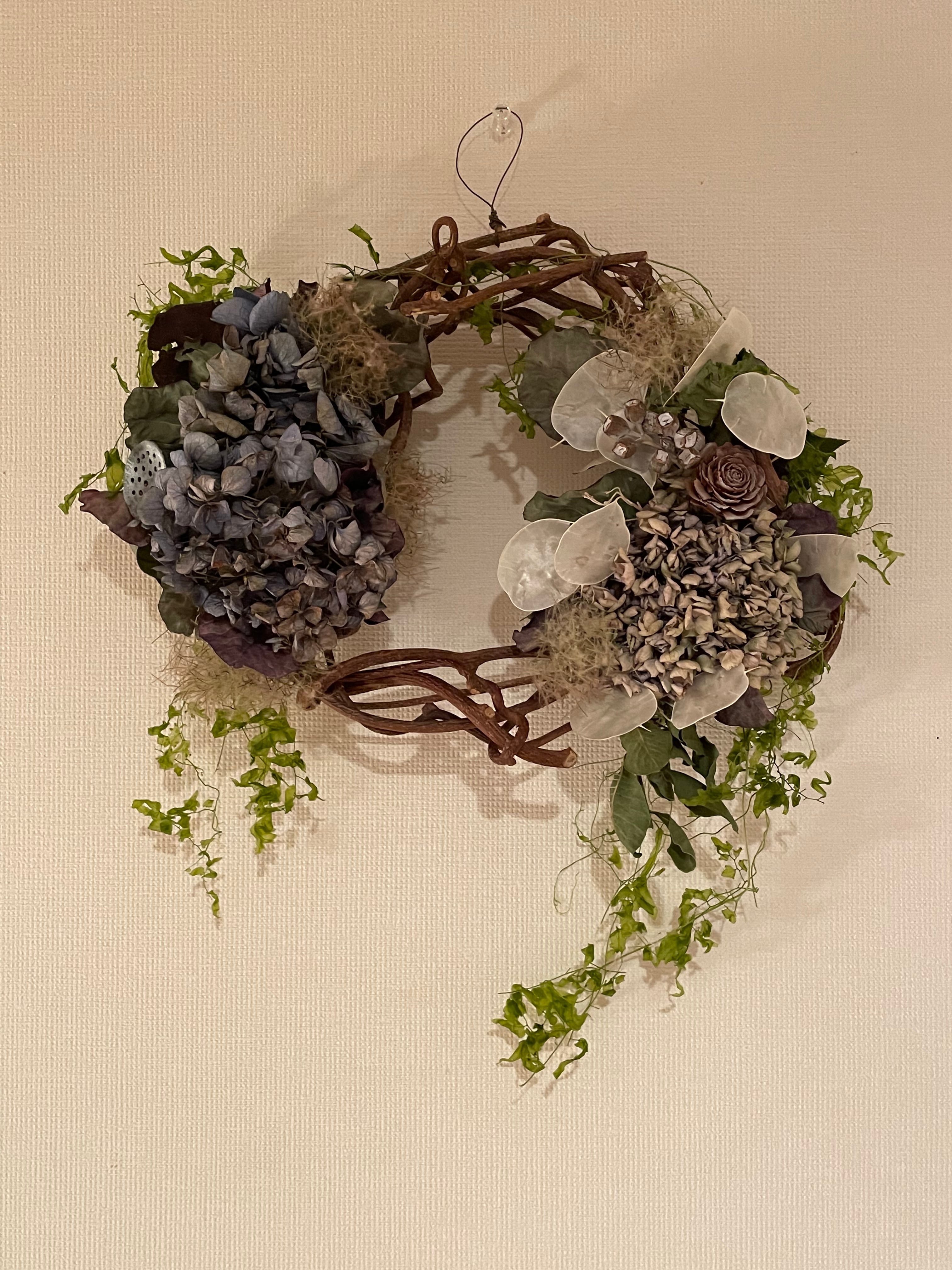 キウイヅルにナチュラルなアンティーク紫陽花とルナリア、ユーカリ、サンウィーバイン、ハスをアレンジしました。