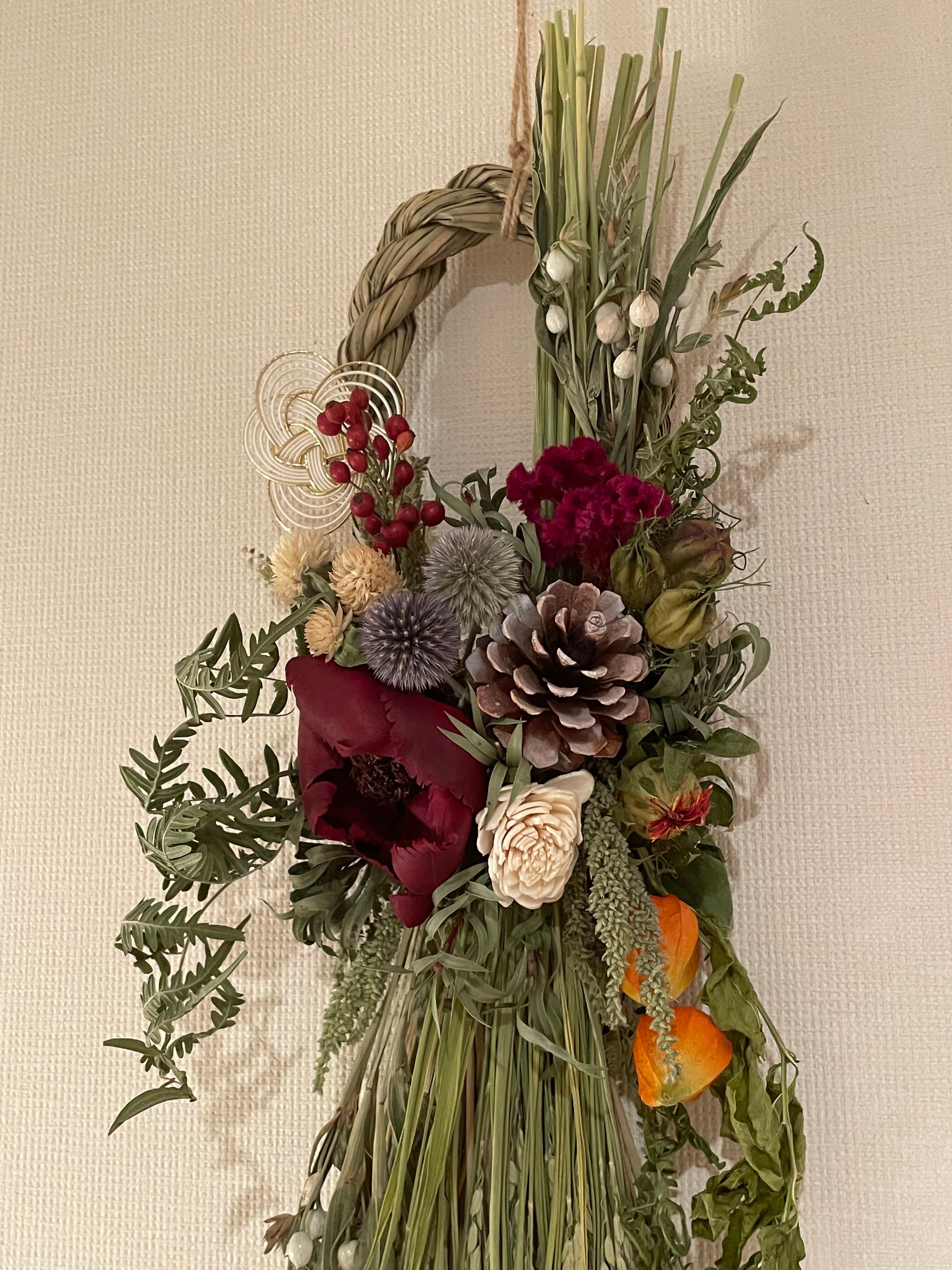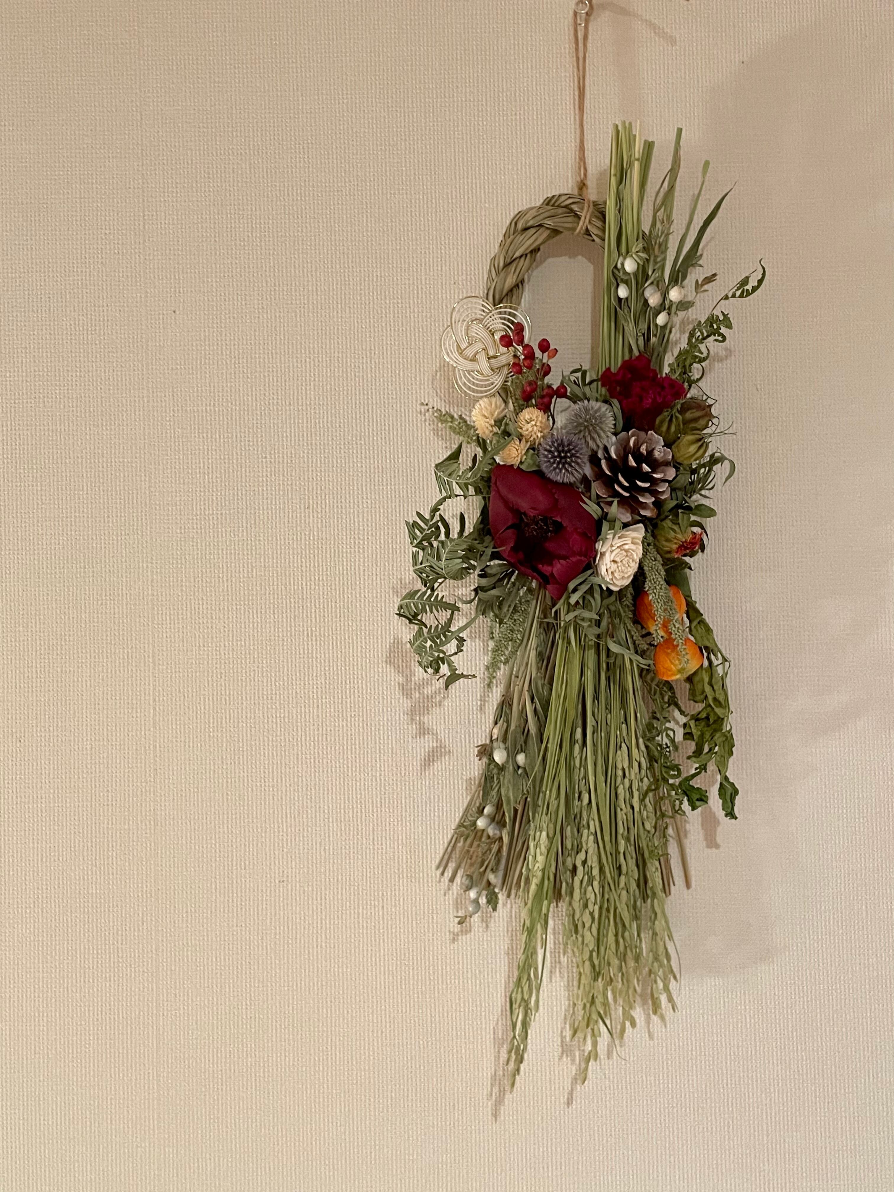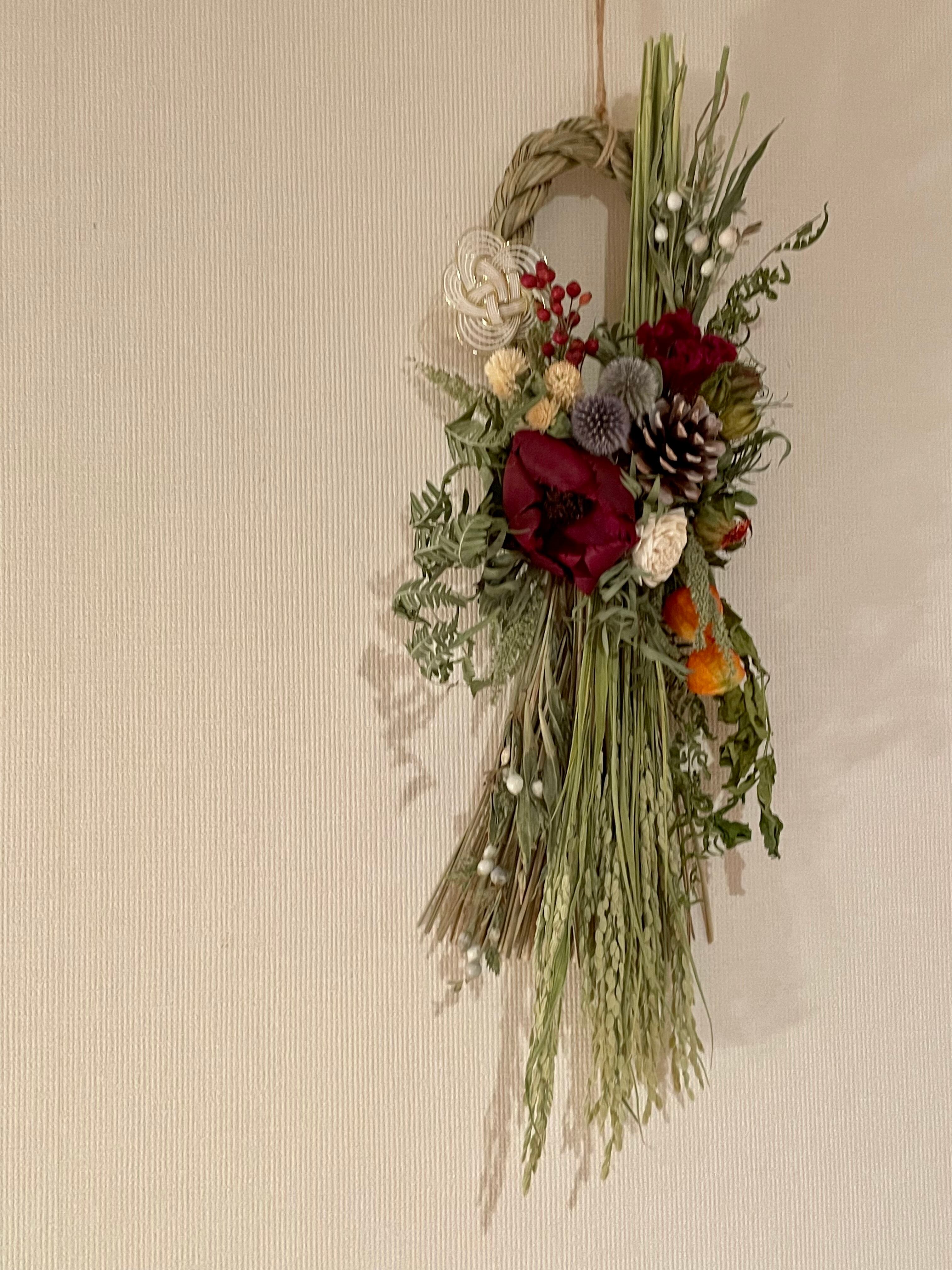 実りの雑穀、イネ、ムギ、ヒエ、数珠玉、ほおづきなどと紅白のお花を合わせて縁起物の梅の水引などを一緒にアレンジしました。