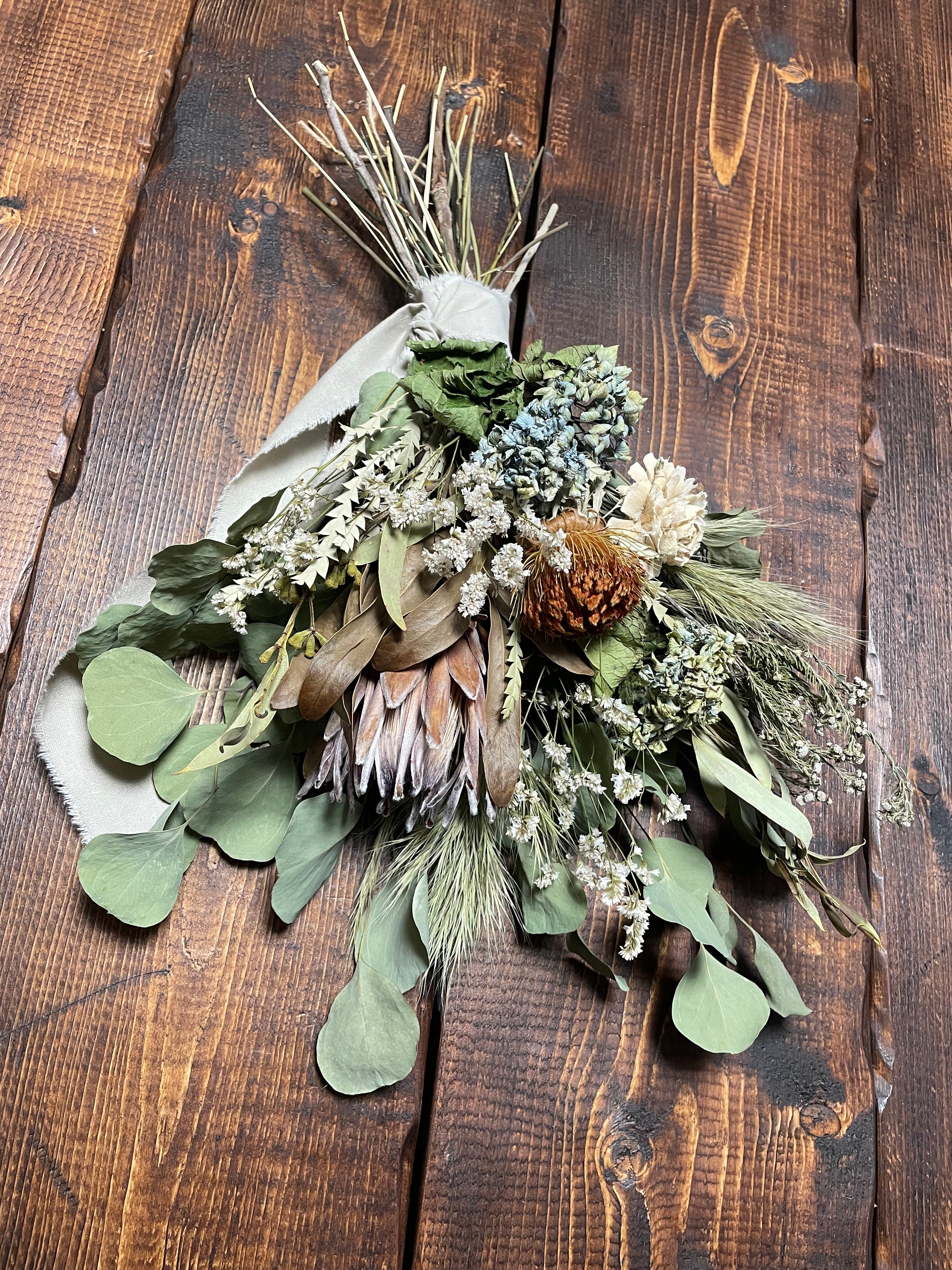 プロテアシルビア、フェルモーサ、フェリカロックのネイティブフラワー、山アジサイ、スターチスの優しい色を加えてコットンのリボンでナチュラルに結びました。