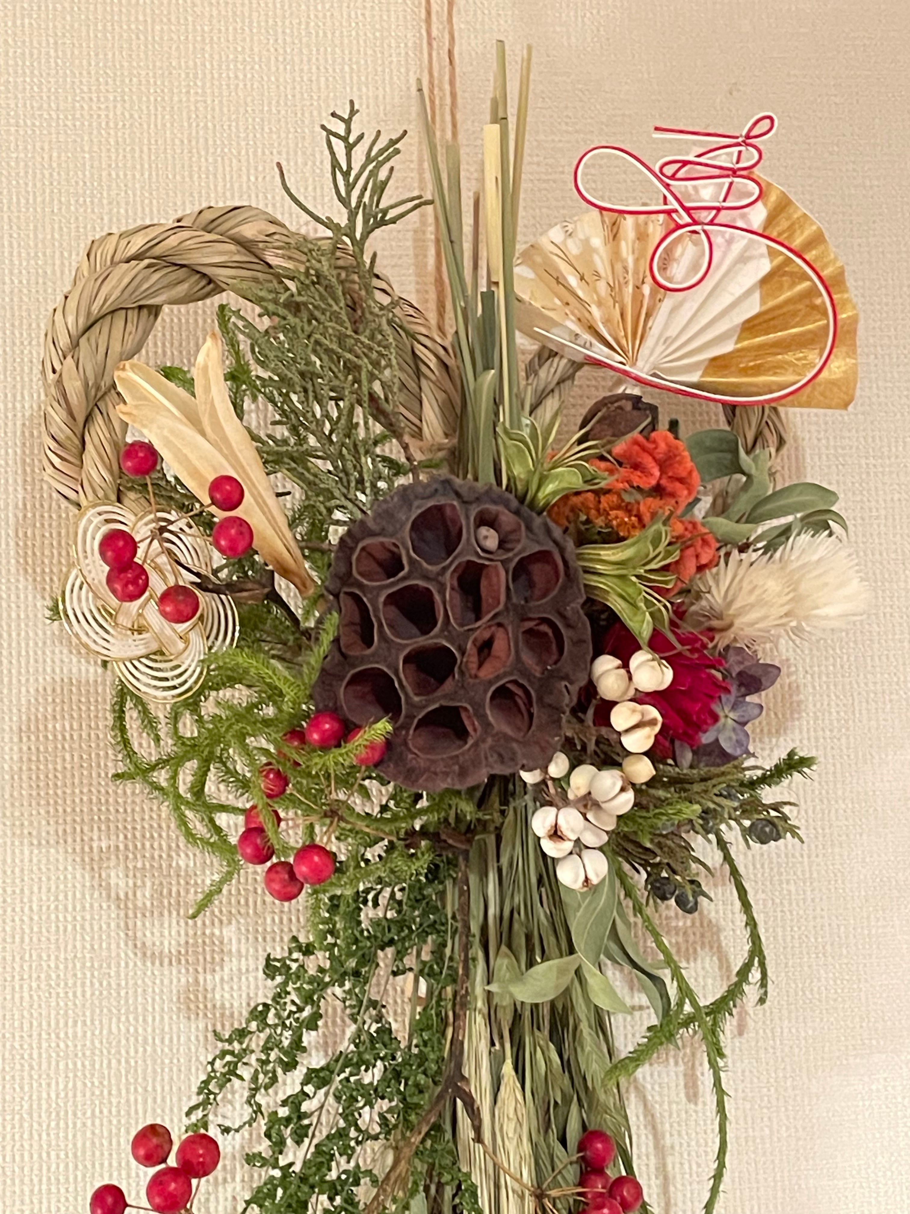 縁起物を併せたドライフラワーのしめ縄飾り。